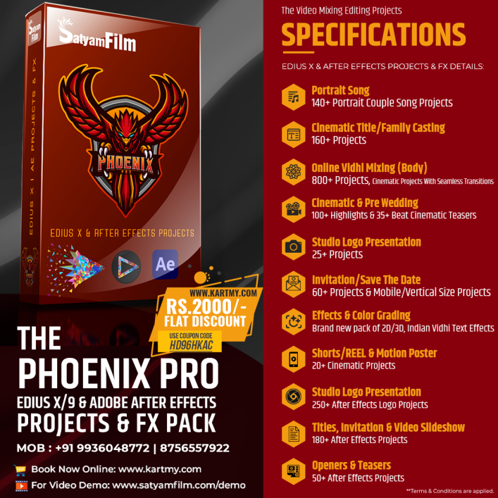 Phoenix Pro : Edius Pro 7/8/9/X – 1700+ Projects collection with added creative graphics, effects, visual fx & beats matching. You can easily make your Portrait Song, Titles, Invitation, Highlights, Pre Wedding & Other video clips within few minutes using our Phoenix Pro Dongle Projects. The projects (dongle) are specially designed for Indian wedding video editors who works on EDIUS.